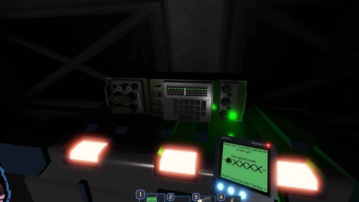 After you collect all eight digits of the code, you can now enter the Hunted event to begin a run. You'll be in the same starting area, except this time head up the stairs on the left, go through the door, and down the stairs again until you reach a keypad. Enter the code you've found and pick up a Decoder from inside. Note that you only need to find this item once. In future runs, you'll always spawn in with it.